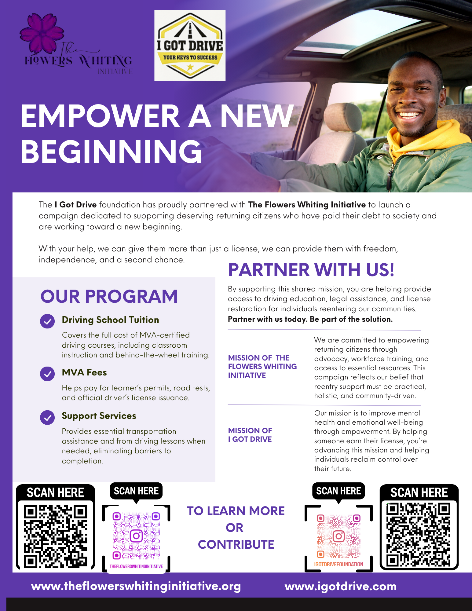 The I Got Drive Foundation has proudly partnered with The Flowers Whiting Initiative to launch a campaign dedicated to supporting deserving returning citizens who have paid their debt to society and are working toward a new beginning.